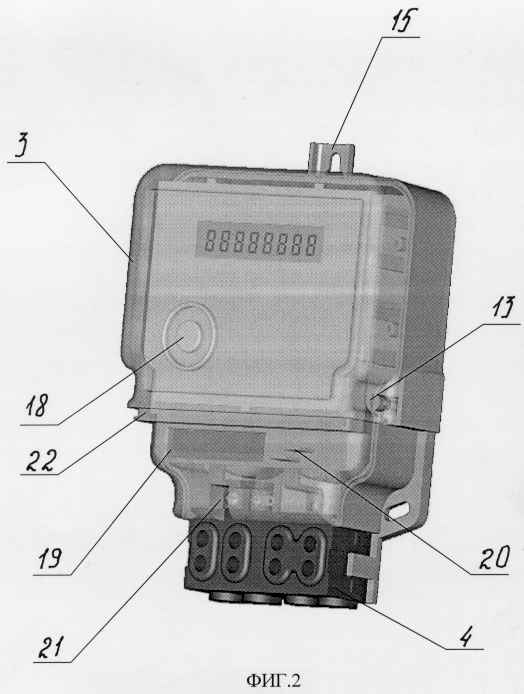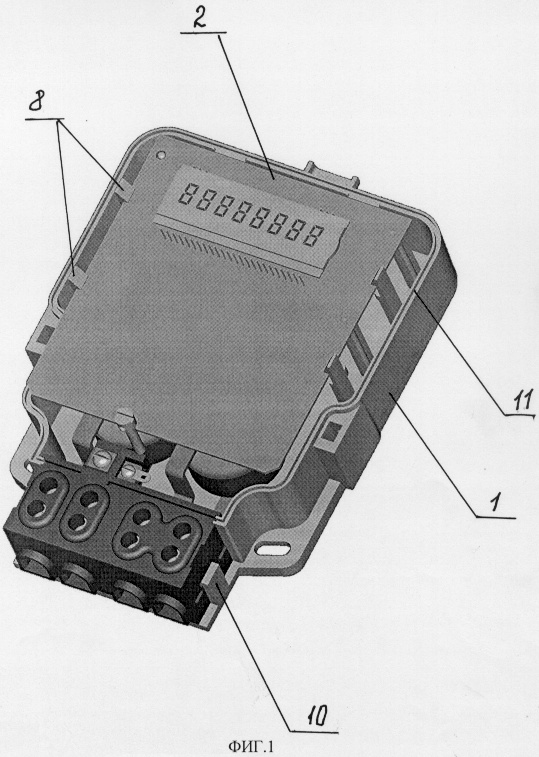 Цоколь 1 прибора позволяет установить печатные платы 2 на двух уровнях, для чего содержит пять стоек 6 для установки платы на верхнем уровне и четыре бобышки 7 для установки печатной платы на нижнем уровне. Для крепления печатной платы на верхнем уровне предусмотрены четыре защелки 8, что обеспечивает быструю и технологичную сборку прибора. Плата на нижнем уровне крепится к бобышкам винтами самонарезающими. Цоколь имеет два внутренних выступа 9 под защелки для надежного крепления кожуха прибора. В нижней части цоколя имеются две защелки 10 для крепления колодки. В месте соединения цоколь и колодка имеют паз 11 и выступ (см. фиг.1) соответственно, что обеспечивает надежное и герметичное соединение. В месте соединения цоколя и кожуха имеются паз 11 и выступ 12 соответственно, в паз цоколя вкладывается герметизирующая прокладка. Крепление кожуха к цоколю осуществляется посредством двух гаек 13, вложенных в соответствующие пазы 14 и закрепленных пружинной шайбой, упирающейся на две бобышки внутри паза. В верхней задней части цоколя находятся углубление и фиксирующая закладная втулка для крепления подвижного уха 15 крепления счетчика. Ухо имеет два фиксированных положения.