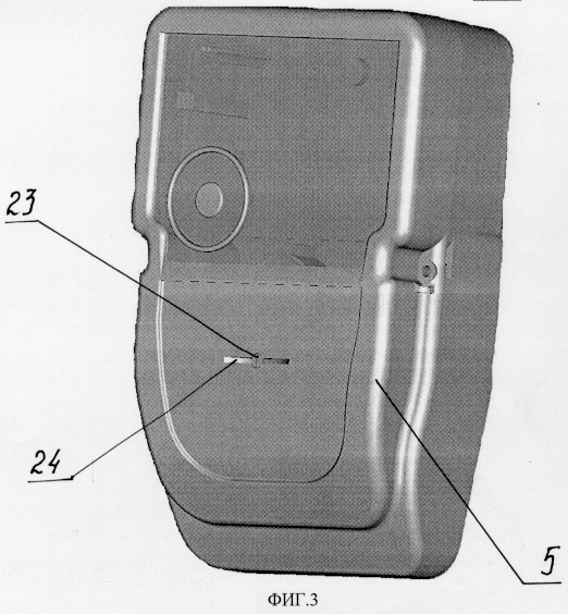 Крышка 5 клеммной колодки имеет одно отверстие 23 для крепления. В глубине отверстия по периметру имеются два выступа, которые препятствуют свободному выпадению крепежного винта из крышки. По бокам отверстия имеются два углубления 24, предназначенные для закладки в них пломбировочного проводника и предотвращения несанкционированного откручивания винта 23. С обратной стороны крышки имеется схема подключения счетчика. В нижней части крышки имеется углубление, представляющее собой тонкую стенку, которая может быть выломана при установке счетчика на объекте.