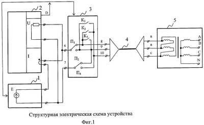 На фиг.1 приведена структурная электрическая схема предлагаемого устройства, совмещенная со схемой электрических соединений. Устройство содержит источник регулируемого переменного напряжения 1 с управляющим входом, многовекторный измеритель 2, имеющий по одному каналу напряжения и тока, и управляющий выход, коммутирующий орган 3, имеющий два входа и три выхода, а также управляющий вход, трехпроводный кабель 4, исследуемый трансформатор 5.