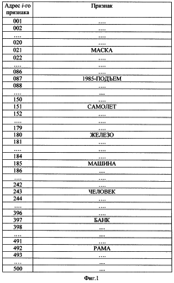 Рассмотрение заявленного способа целесообразно провести на следующем примере. Пусть для формирования базы эталонных информационных признаков выбраны N=100 признаков, из которых первые семь имеют значение: банк, железо, маска, машина, рама, самолет, человек, а сотый признак имеет значение 1985-подъем. Из указанных N выбранных признаков выделяют содержащиеся в них и отличные друг от друга символы и формируют «алфавит символов» (АС) с присвоением каждому символу порядкового номера в АС. Будем считать, что в составе всех N признаков содержатся символы, сведенные в таблицу 1. Каждому символу из АС присвоен порядковый номер nj. Например, символ «ж» имеет номер n=8, символ «9» имеет номер n=24 и т.д.