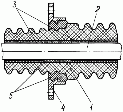 Проходной изолятор состоит из фарфоровой втулки 1, токоведущего стержня 2, компенсирующих втулок 3, фланца 4, заливочного эпоксидного компаунда 5.