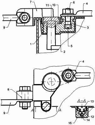 В выводе под болт элементом присоединения является кронштейн и проушина. Указанное конструктивное исполнение вывода частично отвечает эксплуатационным требованиям. При этом существенным его недостатком является частая поломка проушины, особенно в холодное время года при больших токовых нагрузках и многократном подсоединении к ней двух и более проводов сечением 70 мм2.
