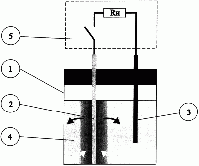 В стеклянный сосуд 1 емкостью 500 мл погрузили медный и графитовый электрод 2, 3. Между ними установили электрическую нагрузку в виде сопротивления. Резистор номиналом 10 Ом, обозначенный на чертеже RH, и переключатель 5. В сосуд налили 30%-ный водный раствор гетерополикислоты 2-18 ряда и имеющую химическую формулу Н6[Р2W18O62] с активизированной электронной оболочкой анионного комплекса.