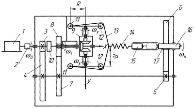 Через колеса 3, 4, 7 и 8 передается вращение на трубчатый вал дифференциала 9, корпус которого приобретает угловую скорость 1. Вал кривошипов до положения, показанного на чертеже, имеет угловую скорость взвода кривошипа y= 0– 1. Затем под действием центробежных сил от угловой скорости 1 инерционные массы 11 и 12 резко увеличивают свои скорости – это им позволяет обгонная муфта 10; через шатуны 13 и пружину (упругий элемент) 14 боек 15 разгоняется до максимальной скорости удара, взаимодействуя в этом момент с инструментом-волноводом 16.