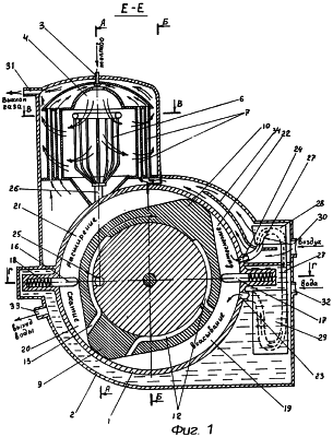 Нижняя и верхняя части кожуха 2 разделены перегородкой. В средней части кожуха 2 имеется отверстие 30 (для впуска наружного воздуха), а в верхней части кожуха 2 – отверстие выхлопа 31 для выпуска продуктов сгорания. В полости, образованной частью кожуха 2 и верхней частью статора 1, установлен разделительный щиток 34. В нижней части кожуха имеется отверстие 32 для впуска охладителя (например, воды) и отверстие 33 для его выпуска.