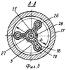 Цикл работы остальных перекачных секций 4 точно такой же, только начало цикла работы каждой секции смещено по времени равномерно в течение цикла работы первой секции, благодаря чему достигается равномерность работы насоса. Управление электрогидравлическими клапанами 13 и 15 задается программой, введенной в процессор блока управления 3. В принципе количество перекачных секций в насосе может быть любое, как и порядок их работы: последовательный, параллельный, последовательно-параллельный. В перекачной секции 4 перекачиваемая жидкость поступает через впускной клапан 7 в кольцевой канал 22, из которого через осевые каналы 23 и радиальные каналы 24 передается к диафрагме 18 и заполняет перекачную полость с минимальными ударами на диафрагму, так как основной гидроудар при открытии впускного канала воспринимает кольцевой канал 22. При этом диафрагма 18 вытесняет масло из гидропроводной полости 6 через отверстия 27 и 28 на слив и облегает каркас 19 (фиг.3) по всему периметру без радиального растяжения и складок. При полном заполнении перекачной полости наблюдается незначительное осевое растяжение диафрагмы, но оно не превышает 5% ее длины и на ресурс ее работы влияния не оказывает. Кроме того, все наибольшие деформации диафрагмы происходят при низком подпорном давлении (до 1,5 МПа). При нагнетании перекачиваемой жидкости масло через отверстия 27 и 28 в каркасе 19 поступает внутрь диафрагмы 18, которая выдавливает перекачиваемую жидкость в каналы 22, 23 и 24 через выпускной клапан 8 в напорную магистраль 12. В конце выдавливания перекачиваемой жидкости диафрагма 18 полностью прилегает к стенкам отверстия трубного корпуса 17 и втулок 21 без растяжения, складок и изгиба, то есть в нагруженном состоянии испытывает только напряжение сжатия от давления, которое может достигать 10 МПа. Таким образом, мертвое пространство перекачных секций сведено к минимуму и не превышает 0,1% от объема перекачной полости, что и дает возможность применять данные насосы при перекачивании нефтегазовых смесей.
