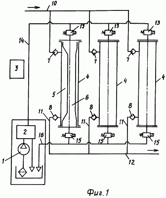 Предлагаемый гидроприводной диафрагменный насос состоит из гидростанции 1, блока контрольно-регулирующей аппаратуры 2, станции управления 3, перекачных секций 4 с перекачными полостями 5 и гидроприводными полостями 6, соединенными с впускными клапанами 7 и выпускными клапанами 8. Впускные клапаны 7 через подпорные трубопроводы 9 соединены с подпорной магистралью 10, а выпускные клапаны 8 – через напорные трубопроводы 11 соединены с напорной магистралью высокого давления 12. Гидроприводные полости 6 с одного торца перекачных секций через электрогидравлические клапаны 13 соединены маслопроводом высокого давления 14 с блоком контрольно-регулирующей аппаратуры 2, а с другого торца через электрогидравлические клапаны 15 – со сливным трубопроводом 16.