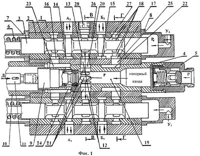 Управление гидравлическим распределителем осуществляется путем подачи под давлением гидравлической жидкости в полости колпаков 7, 8 (Фиг.1) через каналы X1-Х4, У1-У4.