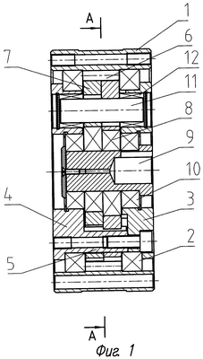 Отличительными признаками в заявляемом изобретении в сравнении с прототипом является то, что цилиндрические отверстия в сателлитах выполнены с радиально-веерно расположенными прорезями, выходящими в отверстие, при этом отверстие внутреннего кольца роликоподшипников входного вала может быть выполнено эксцентрично относительно центра подшипника и содержит на внутренней поверхности радиальный выступ, а также входной вал может быть выполнен составным с С-образными вставками, имеющими на внутренней поверхности участки плоской формы, взаимодействующие с ответными по форме участками на входном валу.