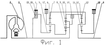Крутящий момент с входного звена 3 передается через солнечную шестерню 8 второго планетарного ряда на водило 9 второго планетарного ряда, где разделяется и передается через коронную шестерню 10 второго планетарного ряда и связанную с ней коронную шестерню 13 третьего планетарного ряда на водило 12 третьего планетарного ряда, а также через солнечную шестерню 8 второго планетарного ряда передается на водило 6 первого планетарного ряда, где разделяется и через включенную фрикционную муфту 15 передается на входное звено 3, а также через коронную шестерню 7 первого планетарного ряда передается на водило 12 третьего планетарного ряда, где объединяется с потоком крутящего момента с коронной шестерни 13 третьего планетарного ряда и далее передается на связанное с водилом 12 третьего планетарного ряда выходное звено 4.