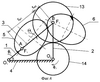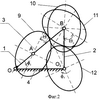 8. Устройство по п.2, отличающееся тем, что передаточный зубчатый механизм выполнен в виде последовательно установленных в зацеплении пары шарнирно установленных на шатуне эллиптических колес, оси вращения которых совмещены с полюсом эллипса, и пары шарнирно установленных на коромысле овальных зубчатых колес, оси вращения которых совмещены с центрами их симметрии.