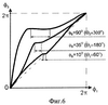 На фиг.5 показан график изменения угла выстоя B в зубчато-рычажном механизме с круглыми колесами ( B=30° на кривой 1) и в зубчато-рычажном механизме с эллиптическими некруглыми зубчатыми колесами ( B=90° на кривой 2). На фиг.6 и 7 показаны графики регулирования угла выстоя в зубчато-рычажном механизме с эллиптическими некруглыми зубчатыми колесами за счет изменения углов установки 1 и 2 некруглых зубчатых колес относительно звеньев рычажного механизма. На графиках (фиг.5, 6, 7) обозначено: 1 – угол поворота ведущего кривошипа; 3 – угол поворота закрепленного на ведомом валу ведомого колеса второй пары 8.