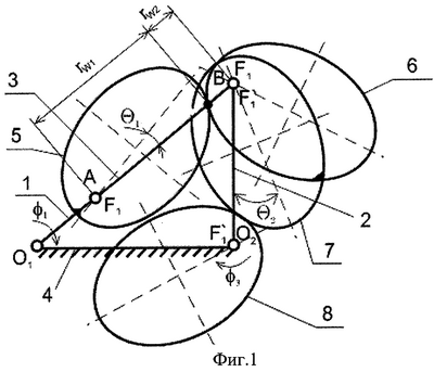 На фиг.1 представлена схема выполнения регулируемого зубчато-рычажного механизма, где оси вращения первой пары эллиптических зубчатых колес 5 и 6 совмещены с их полюсом F1 и соответственно с шарнирами А и В шатуна 3, а оси вращения второй пары эллиптических зубчатых колес 7 и 8 совмещены с их полюсом F1 и соответственно с шарнирами В и О2 коромысла 3. При этом ведущее эллиптическое колесо 5 первой пары закреплено на кривошипе 1 с возможностью углового поворота и последующей фиксации на нем под углом установки 1; ведущее эллиптическое колесо 8 второй пары сблокировано с ведомым колесом 6 с возможностью углового разворота между собой и последующей фиксации на нем под углом установки 2. Ведомое эллиптическое колесо 8 второй пары закреплено на ведомом валу механизма (на фиг.1 не показан).