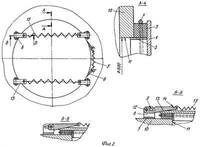 Диск для плотного закрытия отверстия (см. фиг.2) конструктивно состоит из диска 1 с выступом 2, соединенным с диском 1. Диск 1 выполнен из стального листа; выступ 2 – из стальной ленты, вальцованным; сварной конструкции. На выступе 2 уложено резиновое уплотнение 3, прижатое к выступу 2 капроновым канатом 4, с помощью пружины растяжения с зацепами 5, закрепленной в петлях 6 на концах каната 4. Четыре опоры, каждая из которых состоит из плиты 7 и двух стоек 8 с пазами 9 в них, соединенных с плитой 7, выполненных из стального листа сварной конструкции, приварены к трубе 10 по две опоры с противоположных сторон отверстия 11 в трубе 10 и диска 1. В пазах 9 двух стоек 8 в каждой опоре установлены оси 12 с соединенными с ними шарнирно рычагами 13, всего четыре, расположенных горизонтально по два рычага 13 с противоположных сторон диска 1, а к концам каждой пары рычагов 13, с помощью отверстий 14 в них, закреплены две пружины растяжения с зацепами 15, расположенные горизонтально и параллельно между собой на обратной стороне диска 1. Диск для плотного закрытия отверстия работает следующим образом. Диск 1 выступом 2, с уложенным на нем резиновым уплотнением 3, прижатого к выступу 2 капроновым канатом 4, с помощью пружины растяжения с зацепами 5, закрепленной в петлях 6 на концах каната 4, вставляется в отверстие 11 трубы 10 и под действием сжимающих усилий двух пружин растяжения с зацепами 15, расположенных горизонтально и параллельно между собой на обратной стороне диска 1, при закреплении их к концам рычагов 13 с помощью отверстий 14, другим концом рычаги соединены шарнирно с осями 12, установленными в пазах 9 двух стоек 8 в четырех опорах, и при поступательном перемещении рычагов 13 вместе с осями 12 навстречу друг другу с помощью пазов 9 и с помощью конических поверхностей 16 на рычагах рычаги давят на диск 1 и плотно прижимают диск 1 с уплотнением 4 к наружной стенке трубы 10.