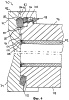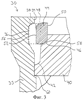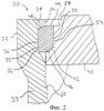 Фиг.2 схематически показывает продольный разрез части камеры 30 давления, которая оснащена внутренним укупорочным приспособлением и входит в состав предложенного пресса. Верхняя часть 32 камеры 30 давления имеет увеличенный радиус. Камера давления имеет стенку 33, внутренняя сторона 34 которой (называемая также внутренней стенкой) поднутрена в пределах этой увеличенной части 32 с образованием выемки 36. Внутренняя стенка 34 вдоль выемки 36, по существу, параллельна внешней стороне камеры 30 давления, за исключением верхней части выемки. В верхней части выемки 36 создана контактная поверхность 38, искривленная в показанной на этом виде плоскости. Камера 30 давления является цилиндрической, следовательно, ее стенка 33 искривлена по кругу относительно ее продольной центральной оси, то есть в поперечной плоскости сечения камеры 30 давления. Это также относится к указанной контактной поверхности 38, которая, таким образом, искривлена в двух плоскостях.
