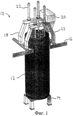 Фиг.1 в аксонометрии изображает предложенный пресс 10 высокого давления. Пресс 10 высокого давления содержит округлую цилиндрическую камеру 12 давления, опускаемую в яму. Нижний конец камеры 12 давления находится на опоре 14, на дне указанной ямы. Верхняя часть камеры давления проходит выше уровня 16 пола или земли. На полу закреплено удерживающее приспособление 18 для гидравлического устройства. Гидравлическое устройство содержит гидравлический блок 20, который управляет вертикальным перемещением четырех гидравлических поршней 22 для поднятия и опускания крышки, закрывающей камеру давления. Гидравлическое устройство также содержит гидравлические поршни (не показаны) для смещения передающих усилие элементов, которые описаны ниже. Кроме того, показан гидравлический поршень 23, назначение которого, среди прочего, заключается в удалении прокладочного элемента, изображенного на фиг.4 и 5.