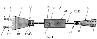 Цифровые обозначения, используемые в графических материалах: токоподводящее устройство (1); вилка (2); проводники электрического тока (3 и 4); штекерная розетка (5); металлические штырьки (6 и 7); изоляционная оболочка (8 и 9); жесткий корпус (10); упругая державка (11); ребра (12-15); продольные ребра (16-21); разборный переключатель технологического тока (22); гибкая часть (23); корпус (24); штекерная розетка (25 и 26); гибкие фасонные ребра (27 и 28); полуформы (29 и 30); жесткий корпус (31); штекерная розетка (32); гибкие фасонные ребра (33 и 34); корпус (35); две разъемные части (36 и 37); резьбовые элементы (38 и 39); оребрение (40 и 41); лак (42); полимерный материал (43).