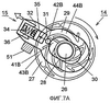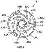 Когда зубчатая секция 24 совершает вращение по часовой стрелке, дисковый элемент 14, прикрепленный к зубчатой секции 24, также совершает вращение по часовой стрелке, как показано на фиг.7А. В это же время штифт 31 скольжения выходит из зацепления с секцией 42В зацепления, рычажный элемент 15 перемещается от дискового элемента 14 под действием усилия от упругого элемента 36, и штифт 31 скольжения передвигается в направлении к канавке 43В.