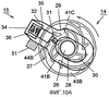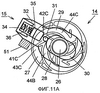 Как показано на фиг.10А, штифт 31 скольжения перемещается по канавке 44В, пока не достигнет переднего конца канавки 44В. Затем штифт 31 скольжения движется под действием под нажимом упругого элемента 36 к канавке 41С в направлении наружу дискового элемента 14 и зацепляет секцию 42С зацепления, как показано на фиг.11А. Также секция 32 остановки вращения рычажного элемента 15 зацепляет элемент 51 зацепления. Посредством этого вращение против часовой стрелки дискового элемента 14 прекращается.