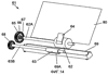 На фиг.4 канавки 41А, 41В, 41С зацепления (далее канавки) расположены симметрично относительно центра дискового элемента 14. Секции 42А, 42В, 42С зацепления расположены в соответствующих канавках 41А, 41В, 41С зацепления. Канавки 43А, 43В, 43С скольжения для разности периферийных скоростей (далее – канавки) расположены последовательно с канавками 41А, 41В, 41С, соответственно, со стороны периферии дискового элемента диска 14 и по периферии дискового элемента 14. Канавки 44А, 44В, 44С скольжения для интервала документов (далее – канавки) проходят от соответствующих канавок 43А, 43В, 43С на дисковом элементе 14 в направлении по часовой стрелке. Здесь канавки 41А, 41В, 41С, канавки 43А, 43В, 43С и канавки 44А, 44В, 44С расположены на дисковом элементе 14 на равных интервалах, симметрично относительно центра дискового элемента диска 14. Канавки 41А, 41В, 41С и секции 42А, 42В, 43С зацепления, соответственно, выполнены с угловым интервалом 120 градусов друг относительно друга. Точно также канавки 44А, 44В, 44С проходят в направлении по часовой стрелке на дисковом элементе 14 и, соответственно, соединены с канавками 41В, 41С, 41А. Секция регулирования приводной мощности включает в себя механизм 40 снижения скорости, дисковый элемент 14, рычажный элемент 15, включающий в себя секцию 32 остановки вращения, и штифт 31 скольжения.