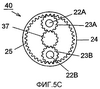 Фиг.5А показывает действие дискового элемента 14 и рычажного элемента 15. Фиг.5В показывает действие разделительного валика 3 и передающего валика 4. Фиг.5С показывает действие центрального зубчатого колеса 37, зубчатого колеса 25 с зубцами на внутренней поверхности и планетарных зубчатых колес 23А, 23В в механизме 40 снижения скорости. Здесь фиг.5А-5С представляют собой схематические виды сбоку дискретного бумагоподающего устройства, если смотреть с левой стороны устройства.