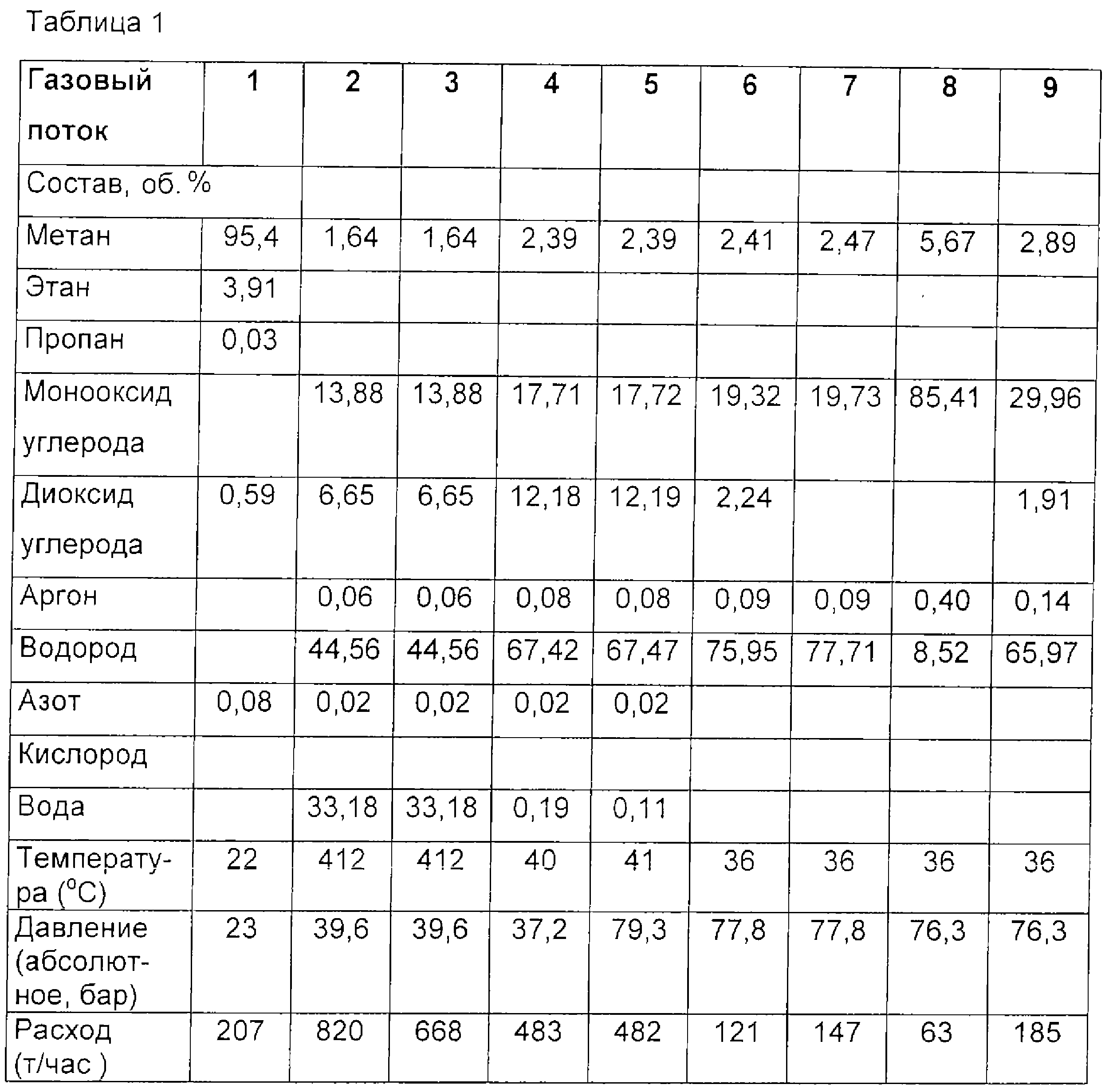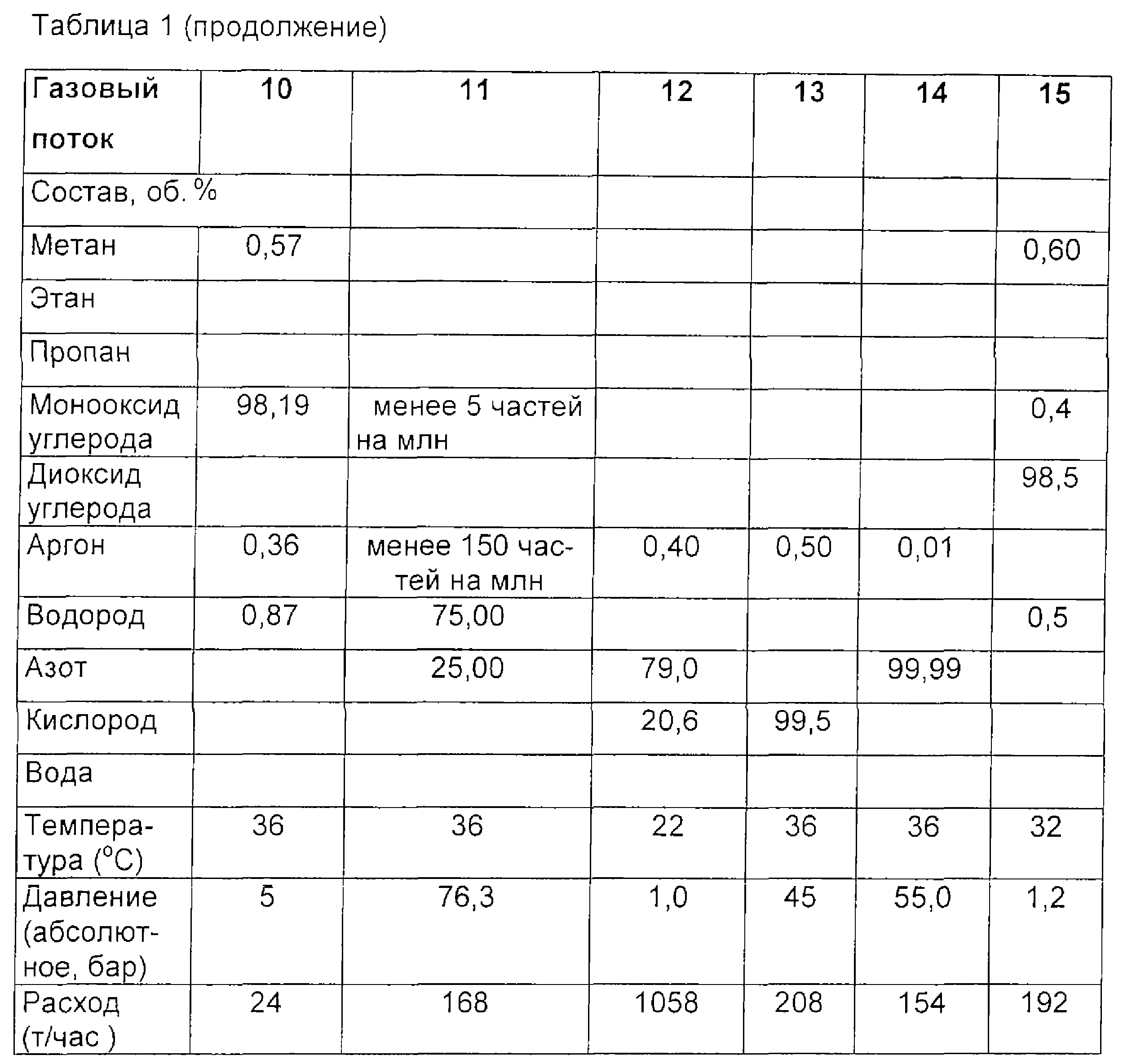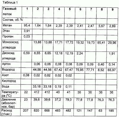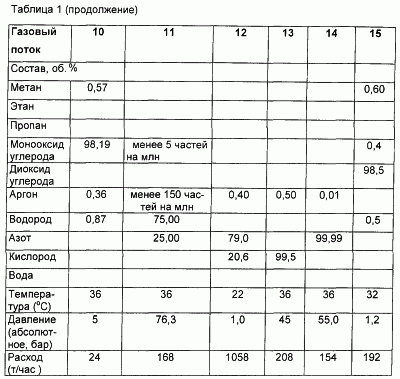 Эти требования могут быть удовлетворены благодаря реализации приведенной ниже последовательности технологических операций, причем состав отдельных газовых потоков представлен в таблице.