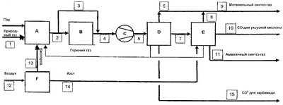 1. Установка для одновременного получения из природного газа метанольного синтез-газа, аммиачного синтез-газа, монооксида углерода и диоксида углерода, отличающаяся тем, что отдельная производственная линия, состоящая из последовательно соединенных друг с другом узлов, включает