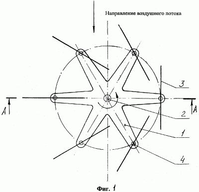 На фиг.1 приведен вид сверху на заявленную ветроэнергетическую установку, которая включает в себя платформу 1, выполненную в виде многолучевой звезды, вращающуюся вокруг оси 2, на концах консолей платформы установлены парусные элементы 3, имеющие ось вращения 4. Устройство работает следующим образом: при набегании воздушного потока на парусные элементы, как показано на фиг.1, за счет значительного превышения аэродинамического сопротивления парусов, находящихся с левой стороны от оси вращения платформы по отношению к аэродинамическому сопротивлению парусов, находящихся с правой стороны от оси вращения, появляется момент силы, сообщающий вращение платформе.