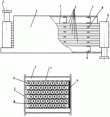 Каждая труба 2 получает температурное удлинение. Поскольку все трубы 2 жестко соединены концами с камерами 3 и 4 и зажаты между боковыми стенками 5 и балками 6 и 7, то все трубы 2 трубного пучка 1 могут получить только одинаковое удлинение, равное среднему значению удлинений труб 2. Разность удлинений выбирается за счет силовой деформации труб. В трубах 2 возникают осевые напряжения. Расчетные оценки показали, что осевые напряжения в аппаратах воздушного охлаждения газа могут достигать значительных величин, приближающихся к пределу текучести материала труб. Причем в более холодных трубах первых рядов возникают напряжения растяжения, а в последних – напряжения сжатия. При сжатии трубы 2 склонны к потере устойчивости – теряют прямолинейность, искривляются. Установлено, что трубы 2 пучка 1 искривляются организованно за счет подвижки в какую-либо одну сторону к боковым стенкам или в две стороны. Искривленные трубы получают форму полуволны. Следствием искривления является образование увеличенных щелей между трубным пучком 1 и одной из боковых стенок. В исходном состоянии прокладка 8, расположенная между трубным пучком 1 и боковой стенкой 3, находится в сжатом состоянии. Давление прокладки на трубы стимулирует потерю их устойчивости со сдвигом в сторону, противоположную прокладке. Образовавшаяся щель заполняется материалом расширившейся прокладки, что исключает проток воздуха через щель. Опытным путем установлено, что размеры щели могут достигать доли от длины трубного пучка 1. Соответственно упругое расширение прокладки 8 должно быть равно или выше этого значения.