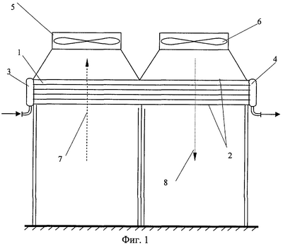 Горячий сырой газ через распределительную камеру 3 поступает в трубы 2 трубного пучка 1, расположенного под вентилятором 5, где охлаждается в первой половине трубного пучка 1 при контакте с потоками холодного воздуха 7, подаваемого вентилятором 5 снизу вверх, и далее поступает во вторую половину трубного пучка 1, расположенную под вентилятором 6, вступая в теплообмен с потоком воздуха 8, который нагнетается вентилятором 6 сверху вниз, и выводится из аппарата через распределительную камеру 4.