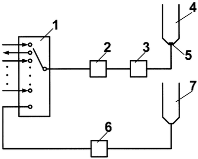 Один из каналов многоходового крана 1 через вспомогательное устройство 6 пробоподготовки может быть соединен с вспомогательной емкостью 7.