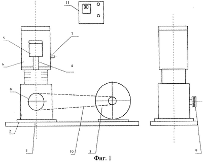 Изобретение поясняется с помощью чертежей, где на фиг.1 изображен общий вид устройства, которое состоит из основания 1, на котором смонтирован одноцилиндровый кривошипно-шатунный механизм 2, приводимый в действие электроприводом 3. На поршне механизма 2 укреплен шток 4, к которому крепится испытательная камера для образца материала 5, а на корпусе блока цилиндра – пылеулавливающая камера 6, соединенная с системой вентиляции для удаления образующейся пыли 7. Маховик 8 механизма 2 приводится в движение электродвигателем 3 через блок ведомых шкивов 9 и клиноременную передачу 10.