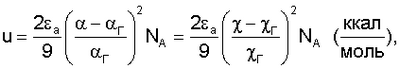 где Настоящее уравнение имеет простой физический смысл, заключающийся в том, что измеряемая величина ( Идеальное состояние вещества должно предполагать то, что составляющие его микрочастицы в том или ином приближении сохраняют свою электронную структуру. В диэлектрическом и/или оптическом эксперименте критерием сохранения электронной структуры является его поляризуемость У атомных систем характер межатомных взаимодействий наиболее простой. Он представлен единственным дисперсионным механизмом притяжения между атомами. К этому же классу могут быть отнесены вещества, образованные недипольными молекулами. В общем случае можно представить молекулу в виде совокупности жестко связанных между собой атомов с эффективным и характерным для нее размером а. Каждая молекула выступает как источник флуктуирующего электрического поля Еа, которым оно оказывает поляризующее действие на свое ближайшее окружение. В результате каждая молекула испытывает со стороны своих соседей всестороннее растяжение, и размеры молекулы во всех направлениях увеличиваются на С другой стороны, стабильность и устойчивость атомов, входящих в состав молекулы, обеспечивают силы кулоновского притяжения, которым соответствует энергия Определим относительное возмущение электронной оболочки поляризующим полем Еа как отношение энергии возмущения