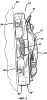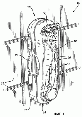 На Фиг.6 и 7 крышка 18 имеет поддерживающие поверхности 60, 62, стремящиеся соответствовать задней поверхности ручки 15, которая выполнена для использования женщинами при бритье подмышек и ног. Эта ручка показана в Патенте США №407851 на промышленный образец, который включен сюда посредством ссылки. Нижняя часть ручки 15 зацепляется и поддерживается отверстием 28, а верхний участок ручки 15 расположен в промежутке между крылышками 26 и снаружи от поддерживающей поверхности 62 и зацепляется крылышками 26. Плоский участок 64 обеспечен на верхнем конце крышки 18, чтобы обеспечить промежуток для лезвийного узла прикрепленного бритвенного сменного блока 13. Задняя поверхность ручки 15 полностью соответствует и подобна наружной поверхности крышки 18. Пользователь захватывает стороны ручки 15, когда не имеется достаточного пространства для пальцев пользователя, чтобы захватить заднюю поверхность ручки 15.