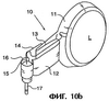 Во втором и предпочтительном варианте выполнения акустический наушник L прикреплен в наклонном положении к переднему рамочному элементу 5. Для этого предусмотрен зажим 10 с гнездом 11, в котором размещен акустический наушник. Зажим 10 выполнен в виде пластмассового или металлического элемента, имеющего первую, наружную стойку 12 и вторую, внутреннюю стойку 13, выполненные с возможностью зацепления наружной и внутренней стороной, соответственно, с передним рамочным элементом 5 в прикреплении защелкиванием акустического наушника. Гнездо 11, предпочтительно, соединено наклонно со второй, или внутренней, стойкой 13 зажима в угле пересечения, обеспеченном для повышения смещающего эффекта переднего рамочного элемента в надетом положении утепляющего наушника. Наружная стойка 12, предпочтительно, оканчивается в отгибаемой задней концевой части 14, зацепляя наружную сторону покрытия из ткани в положении защелкивания зажима 10 и акустического наушника L. Наружная стойка 12 имеет такую длину, что отгибаемый задний конец 14 обеспечивает зацепление силами трения с передней поверхностью утепляющего наушника в положении защелкивания. Как показано пунктиром, выполненный с возможностью отгибания задний конец 14′ может быть направлен внутрь для удержания ткани в зажатом зацеплении между гнездом 11 и концом 14′. См. Фиг.8, 9 10а и 10b.