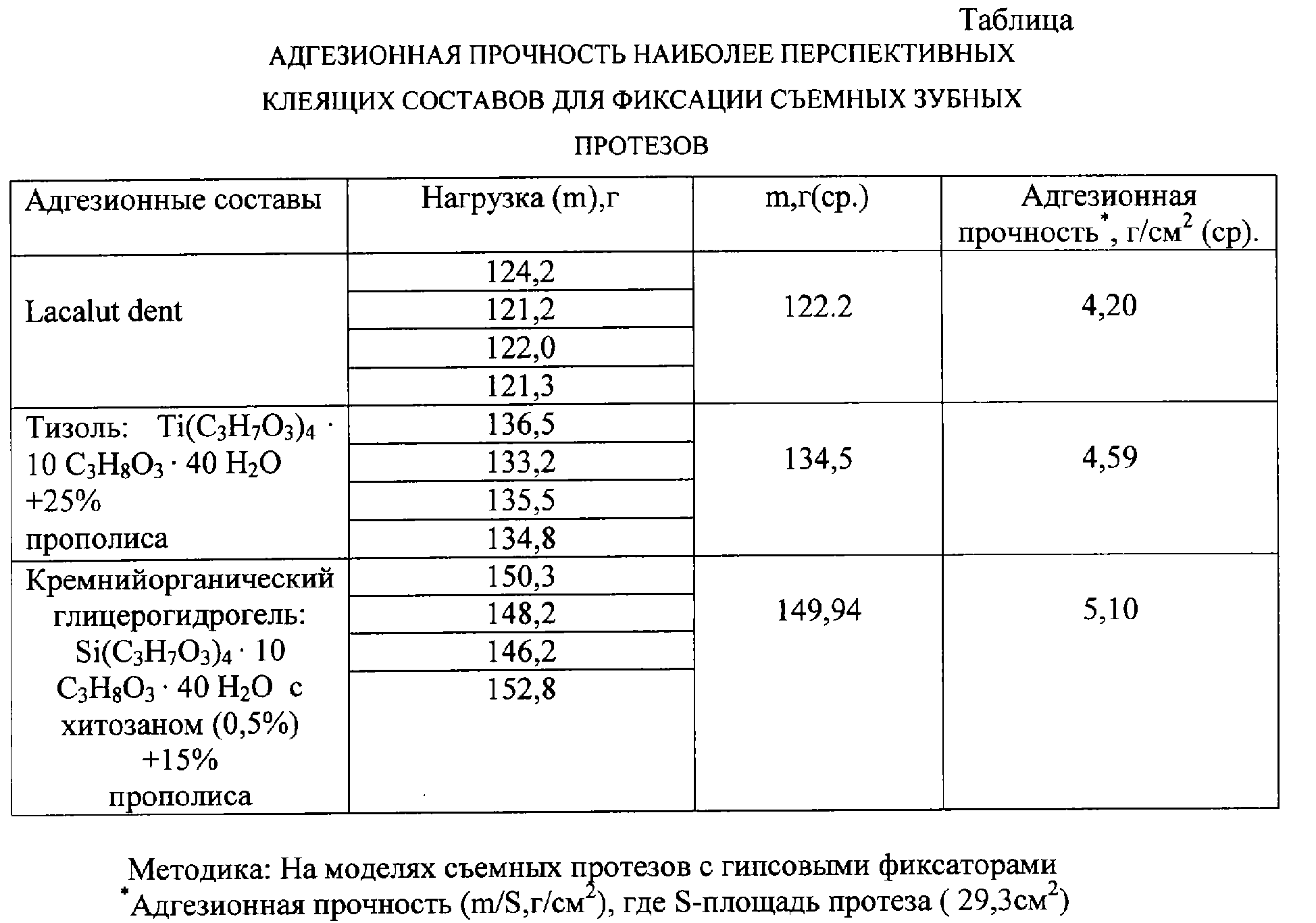 В настоящее время из патентной и научно-технической литературы не известно средство для фиксации съемных зубных протезов, содержащее в своем составе кремнийорганический глицерогидрогель. Предлагаемое средство отличается от прототипа использованием кремнийорганического глицерогидрогеля. Способ получения кремнийорганического глицерогидрогеля разработан в Институте органического синтеза Уральского отделения РАН (Решение от 9.12. 2004 года о выдаче патента РФ по заявке № 2003124688; приоритет от 07.08.2003 года). Кремний является эссенциальным элементом для нормального функционирования организма человека. Известна способность кремния концентрироваться в определенных органах, а также стимулировать пролиферативно-репаративные процессы всех видов тканей: эпителиальных, кожных, соединительных, костных (Воронков М.Г., Зелчан Г.И., Лукевиц Э.Я. Кремний и жизнь. Биохимия, фармакология и токсикология соединений кремния. Рига: Зинатне, 1978, 587 с.). Используемый в предлагаемом средстве кремнийорганический глицерогидрогель состава Si(С3Н7O3)4·хС3H8О3·yH2O, где 6 Предлагаемое средство отличается от прототипа также наличием в составе хитозана в концентрации 0,5-1,0 мас.%. Хитозан – уникальная биологически активная добавка, улучшающая адгезионные свойства состава, обладающая бактерицидным и антигрибковым действием, оказывающая благоприятное воздействие на слизистую оболочку полости рта. В предлагаемом средстве хитозан выполняет также роль дополнительного пленкообразующего вещества, что увеличивает влагостойкость состава (уменьшает его смываемость в процессе использования в протезах). Добавка хитозана менее 0,5% слабо влияет на адгезионные и медико-биологические характеристики, более 1,0% нецелесообразна, т.к. уже не приводит к существенному улучшению эксплуатационных свойств предлагаемого средства. В состав предлагаемого средства также входит прополис в концентрации 5,0-15,0%. Концентрация прополиса менее 5% снижает эффективность состава, а более 15% нецелесообразна вследствие ухудшения физических характеристик состава и его удорожания. Средство для фиксации съемных зубных протезов готовится смешением прополиса и кремнийорганического глицерогидрогеля с хитозаном при нагревании. Консистенция и цвет средства зависят от содержания прополиса. На консистенцию средства также влияет состав кремнийорганического глицерогидрогеля. Пример 1. Средство приготавливают по следующей общей методике. В разогретую до 60-80°С основу, содержащую кремнийорганический глицерогидрогель и хитозан, при перемешивании в смесителе порциями добавляют заранее рассчитанное количество мелко измельченного при охлаждении прополиса для получения необходимого состава. Берут следующее соотношение компонентов, мас.%: прополис 15,0, хитозан 0,5, кремнийорганический глицерогидрогель состава Si(С3Н7O3)4·10 C3Н8О3·40 H2O – 84,5. Полученный состав представляет собой густую коричневую массу, по консистенции аналогичную питательным кремам, удобную для равномерного нанесения и распределения ватным шариком или марлевым тампоном. Пример 2. Средство приготавливают по вышеописанной методике. Берут следующее соотношение компонентов, мас.%: прополис 5,0, хитозан 1,0, кремнийорганический глицерогидрогель Si(С3Н7O3)4·6 C3Н8О3·24 H2O – 94,0. Полученный состав представляет собой густую коричневую массу, по конс