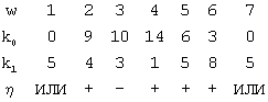 Здесь из распределения Rw для третьего столбца ячеек блока 9 очевидно, что ситуация или возможна только для аргументов х X1, так как (k0(1)=0) & (k1(1)=5) и (k0(7)=0) & (k1(7)=5). Поэтому выход 17 верхней ячейки второго столбца и выход 18 нижней ячейки второго столбца следует соединить с входами элементов ИЛИ соответственно верхней и нижней последовательностей. При этом на выходе 13 устройства появится “логическая единица”, что обеспечит реализацию значения (x)=1 для соответствующих аргументов х. В таблице для (1) и (7) соответственно указаны символы ИЛИ вместо значений настроек. Коррекция подобласти определения X1 формально описывается выражением X1:=Х1-X1 1-Х7 1. Соответственно сокращается анализируемый диапазон и w принимает значение w {2,…,6};