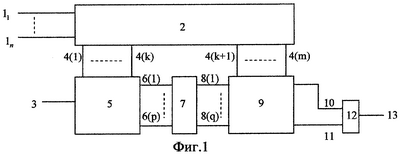 Из распределения для пятого столбца ячеек блока 9 также очевидно, что ситуация w(x)=2 или w(x)=8 возможна только для аргументов x X1, так как (k0(2)=0) & (k1(2)=2) или (k0(8)=0) & (k1(8)=4). Поэтому выход 17 верхней ячейки четвертого столбца блока 9 и выход 18 нижней ячейки четвертого столбца блока 9 следует соединить с входами элементов ИЛИ соответственно верхней и нижней последовательностей элементов ИЛИ. При этом на выходе 13 устройства поступит “логическая единица”, что обеспечит реализацию значения (x)=1 для соответствующих аргументов х. В таблице для (2) и (8) соответственно указаны символы “ИЛИ” вместо значений настроек ячеек коммутации;