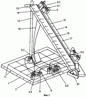 Затем к переключателю 3-4 подключают секундомер 3-6. Переключателем 3-4 разрывают цепь электромагнита 3-3, при этом металлический шарик 18 начинает движение, а секундомер 3-6 производит отсчет времени. Остановку отсчета времени производят датчиком 3-5, установленным в соединительном гнезде 17 пластины 14 и соединенным с секундомером 3-6 проводниками 19.