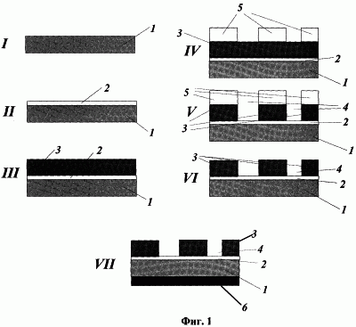 Изобретение относится к области изделий интегральной электроники, работающих на частотах свыше 100 МГц, в частности к области изготовления СВЧ гибридных интегральных схем (ГИС), содержащих хотя бы один из элементов: полосковые линии, двухпроводные линии, тонкопленочные электроды либо резонаторы, фильтры, выполненные на основе двухпроводных или полосковых линий. Эти ГИС содержат диэлектрическую подложку с нанесенным на нее пленочным покрытием, которое состоит по меньшей мере из двух слоев, нанесенных в следующем порядке: адгезионного подслоя и слоя металлизации. Слой металлизации обычно состоит из металлов – серебра, золота, меди или алюминия [1]-[3] с удельным сопротивлением менее 3·10-8 Ом·м. Изготовление ГИС включает нанесение на диэлектрическую подложку пленочного покрытия с заданной топологией, состоящего по меньшей мере из двух слоев, нанесенных в следующем порядке: адгезионного подслоя и проводящего слоя из металла или сплава с удельным сопротивлением менее 3·10-8 Ом·м, и последующую фотолитографию и травление нанесенных слоев для формирования заданной топологии. С обратной стороны подложка обычно содержит слой металлизации [1]-[2]. Топология металлизации с обратной стороны диэлектрика может быть различной. Она может быть сплошной (заземляющий слой металлизации) [1], [2], она может повторять топологию лицевой стороны, тогда проводники лицевой и обратной стороны образуют двухпроводную линию передачи [6]. Заявляемый способ может быть использован также для реализации одной из стадий изготовления многослойных печатных плат, связанной с формированием проводников. В этом случае металлизация обратной стороны может иметь свою собственную топологию и структуру, не совпадающую с топологией лицевой стороны, или отсутствовать.
