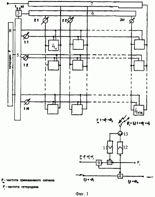 Антенная решетка на фиг.1 работает следующим образом. Сигналы служебных частот строки f1=f+ f и столбца f2=f- f получаются на одном задающем смесителе 3.