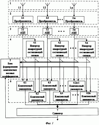Антенные элементы 1.1, 1.2, … 1.n предназначены для приема сигналов, подлежащих последующей обработке, и размещены на расстоянии в половину длины волны друг от друга на одной прямой и в совокупности образуют линейную антенную решетку. Блок 2 обработки сигналов предназначен для преобразования в комплексную форму сигналов путем выделения из сигналов, поступающих с выходов антенных элементов 1.1, 1.2, … 1.n, квадратурной и синфазной составляющих посредством преобразователей 2.1, 2.2, … 2.n, вход каждого из которых соединен с выходом соответствующего антенного элемента 1.1, 1.2, … 1.n, а выход – с входом соответствующего АЦП 3.1, 3.2 … 3.n блока 3, предназначенного для преобразования комплексной формы сигналов в цифровую форму. Выход каждого из АЦП 3.1, 3.2 … 3.n соединен со входом соответствующего инвертора 4.1, 4.2, … 4.n квадратурной составляющей сигнала блока 4 комплексного сопряжения сигналов, с первым входом блока 5 формирования комплексных весовых коэффициентов и с первым входом соответствующего комплексного умножителя, например с нечетной нумерацией 6.1, 6.3, … 6.2n-1, а выход каждого из инверторов 4.1, 4.2, … 4.n соединен с первым входом блока 5 формирования комплексных коэффициентов и с первым входом соответствующего комплексного умножителя с четной нумерацией (6.2, 6.4 … 6.2n). Вторые входы всех комплексных умножителей 6.1, 6.2, 6.3, 6.4 … 6.2n-1, 6.n соединены с выходом блока 5 формирования комплексных весовых коэффициентов, а выходы – с входной шиной сумматора 7, выход которого, являющийся выходом устройства, соединен со вторым входом блока 5 формирования комплексных весовых коэффициентов.