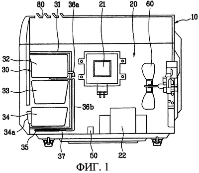 Согласно фиг.1, 2 и 3 микроволновая печь с кофеваркой включает в себя корпус 10, образующий внешнюю оболочку изделия, аппаратное отделение 20, расположенное в корпусе 10, блок 30 кофеварки, расположенный с одной стороны аппаратного отделения 20, вентилятор 60 и блок управления (не показан).