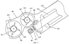 Передний вращающийся элемент 46 также оснащен подающими рейками 64, которые могут быть снабжены соответствующими рабочими инструментами, кромки которых описывают наружную окружность 66. На фиг.2 видно также, что передний вал 67 сепарирующего ротора 24 поддерживается подшипником 68 и проходит в редуктор 70, выходной вал которого проходит поперечно к боковой стороне комбайна для привода других компонентов машины. Подшипник 68, а следовательно, и передний вал 67 сепарирующего ротора 24 укреплены на задней стенке 72 нижней секции. На фиг.2 этого не показано, однако оптимальным является крепление редуктора или генератора также на этой задней стенке 72.