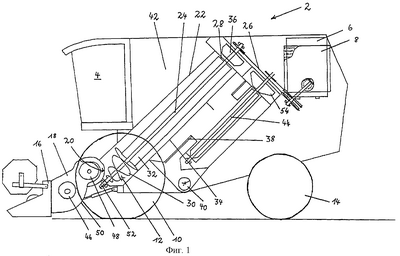 Представленный на фиг.1 зерноуборочный комбайн 2 содержит кабину 4 водителя, двигатель 6 с системой 8 охлаждения, передние колеса 10 с осью 12 вращения и задние колеса 14. Зерноуборочный комбайн оснащен также передним оборудованием, которое показано здесь в виде режущего аппарата 16, но может представлять собой любое другое оборудование в виде подборщиков, зерновых жаток и подобных аппаратов, и корпусом 18 питателя для подачи убранной массы от режущего аппарата 16 в питающее или загрузочное отверстие 20 корпуса 22 ротора, который является частью сепарирующего узла. Внутри корпуса 22 ротора расположен сепарирующий ротор 24, приводимый во вращение от двигателя 6 с помощью приводных элементов 26, которые показаны здесь в виде ременных передач. По направлению вдоль оси вращения сепарирующего ротора 24 от питающего отверстия 20 к разгрузочному концу корпуса 22 ротора передняя секция сепарирующего ротора 24 содержит шнековые лопасти 30, которые примерно определяют длину загрузочной зоны, где убранная масса подается в корпус 22 ротора. Средняя и задняя секции сепарирующего ротора 24 оснащены бильными пластинами 32, которые примерно определяют длину зоны сепарирования вдоль длины корпуса 22 ротора. Следует отметить, что органы для подачи убранной массы в корпус ротора и для обмолота и сепарирования убранной массы могут быть отличными от шнековых лопастей или бильных пластин 32, которые упомянуты здесь в качестве примеров выполнения. Очевидно, что специалист в данной области может выбрать другие известные органы для выполнения желаемых функций.