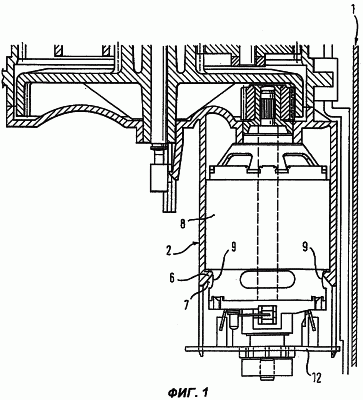 Кухонный прибор (фиг.1) имеет корпус 1, в котором установлено приемное устройство 2. Приемное устройство 2 выполнено либо из металла, либо из пластика. Приемное устройство 2 имеет форму полого цилиндра с открытым нижним торцом. От этого торца в боковой стенке 3 (фиг.3) приемного устройства 2 проделаны прорези 4, делящие боковую стенку 3 на сегменты 5. Сегменты 5 стенки благодаря эластичности материала, из которого выполнено приемное устройство 2, достаточно упруги, чтобы их можно было немного раздвинуть в стороны. На сегментах 5 стенки чередуются обращенные внутрь выступы или стопорные лапки 6. Они имеют обращенные внутрь, наклонные по направлению введения, плоскости 7, по которым можно вдвинуть электродвигатель 8, так чтобы стопорные лапки 6 вошли в зацепление с отверстиями 9 в наружной стенке электродвигателя 8. Благодаря этому электродвигатель удерживается по периметру, например, четырьмя стопорными лапками 6 и тем самым надежно фиксируется.