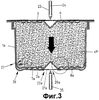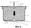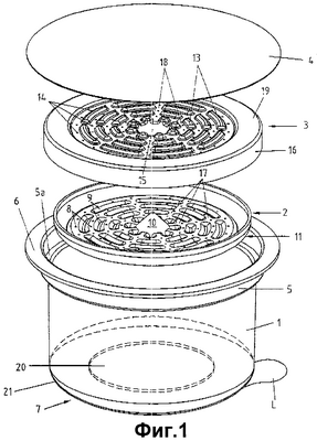 Верхняя область нижней части 1 кассеты, слегка расщиряющаяся по корпусу к его вершине, имеет расширенный участок 5, образующий кольцевое плечо 5а на внутренней поверхности кассеты, служащее для поддержки верхнего распределительного элемента 3. Вверху чашеобразная часть 1 кассеты содержит периферийный краевой участок 6, на котором крепится крышка 4, предпочтительно путем приваривания. Как схематически показано на Фиг.1 пунктирными линиями, дно 7 чашеобразной части 1 кассеты выполнено с круглым отверстием 20 для формирования прохода 22, который покрыт фольгой 21. Фольга 21 содержит клапан L, выступающий сбоку из чашеобразной части 1 кассеты и облегчающий ручное удаление фольги 21. Чашеобразная часть 1 кассеты и крышка 4 так же, как и фольга 21, состоят из газонепроницаемого многослойного композитного материала, благодаря чему нижняя часть 1, по сравнению с крышкой 4 и фольгой 21, имеет устойчивые размеры, является сравнительно жесткой, гибкой и упругой.