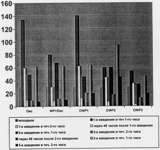 Для изучения влияния озонированного физраствора с разной концентрацией озона на сократительную функцию матки у коров провели эксперимент. Животным первой группы внутривенно вводили окситоцин в дозе 25 БД. Коровам второй группы назначали физиологический раствор в объеме 1000,0 мл. Животным третьей группы внутривенно вводили озонированный физиологический раствор в объеме 1000,0 мл с концентрацией озона 1,2 мг. Коровам четвертой группы интравенозно инъецировали озонированный физиологический раствор с концентрацией озона 2,2 мг. Животным пятой группы внутривенно вводили озонированный физиологический раствор с концентрацией озона 5,3 мг. Дополнительно подопытным коровам помимо ОФР внутривенно вводили окситоцин в дозе 25 ЕД. В качестве контрольных использовались животные первой и второй групп (см. чертеж).