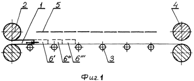 Прокатываемый металл 1 (фиг.1) покидает клеть 2 и по рольгангу 3 передается в клеть 4 (применительно к широкополосовому стану горячей прокатки – в группу чистовых клетей). Над рольгангом 3 расположена группа секций 5 экранов ТСУ, каждый из экранов, точнее их отражательную поверхность, нагревают до температуры поверхности металла 1 в момент его вступления в тепловое взаимодействие с теплоотражательной поверхностью экранов 5 (в положении 6′, 6″, 6″‘ и т.д. металла). Нагрев осуществляют пропусканием электрического тока по элементу экрана 5, обращенному к металлу 1 и образующему отражательную поверхность экранов ТСУ (детали пропускания тока по элементу экрана для его нагрева здесь не рассматриваются, т.к. не составляют сущности предложенного способа).