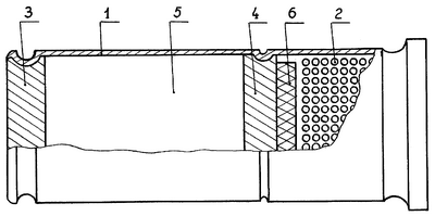 Ультразвуковой патрон содержит гильзу 1 и пороховой заряд 2. В гильзу 1 завальцованы на некотором расстоянии друг от друга два металлических диска 3 и 4. Образуемый дисками 3 и 4 и стенкой гильзы 1 объем 5 заполнен гелием. Обращенная к пороховому заряду 2 поверхность диска 4 покрыта веществом 6, имеющим высокую температуру горения.